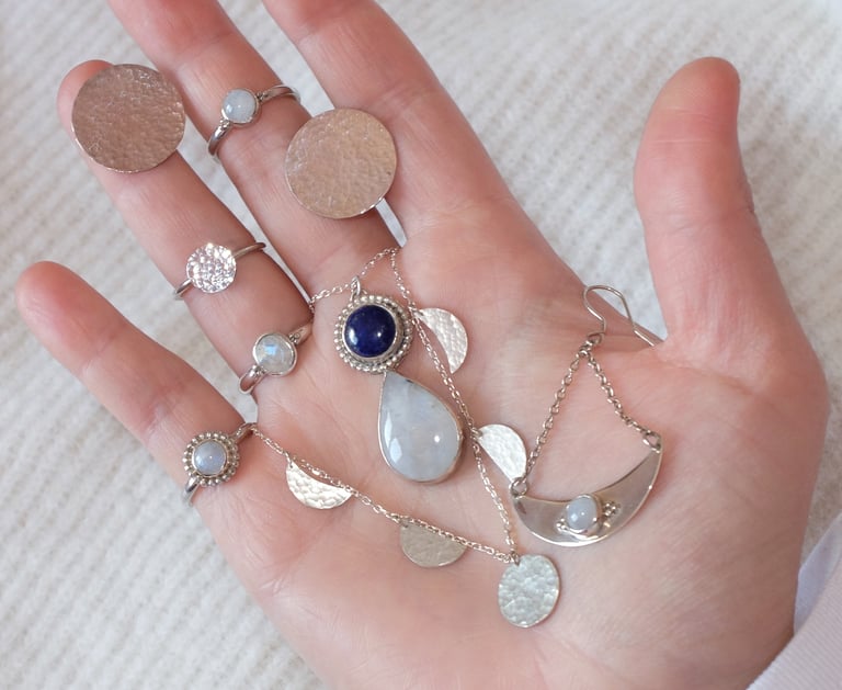 L'argent et les pierres naturelles m'ont permis de créer une collection entièrement fabriquée à la main inspirée par la beauté de la Lune et des astres du ciel nocturne.