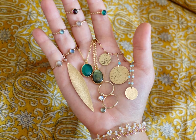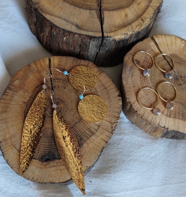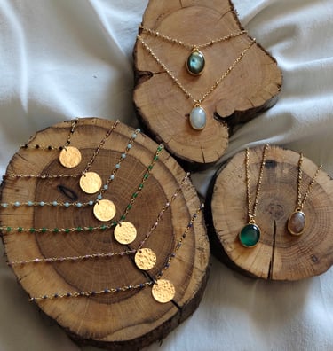 Collection inspirée de la culture Inca et de son culte au Soleil, entièrement fabriquée à la main en plaqué or et pierres naturelles.