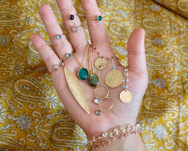 Collection inspirée de la culture Inca et de son culte au Soleil, entièrement fabriquée à la main en plaqué or et pierres naturelles.